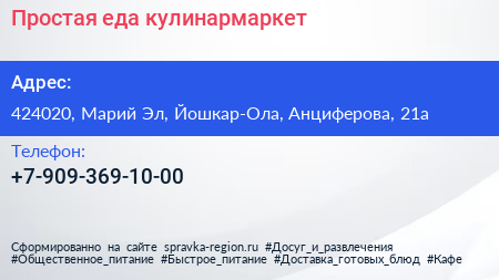 Простая еда, кулинармаркет по адресу 424020, Марий Эл, Йошкар-Ола, Анциферова, 21а в дальнейшем Организация, размещена в следующих категориях: