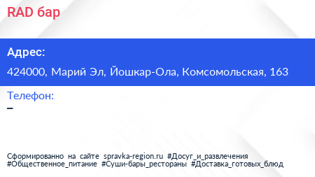 RAD, бар по адресу 424000, Марий Эл, Йошкар-Ола, Комсомольская, 163 в дальнейшем Организация, размещена в следующих категориях: