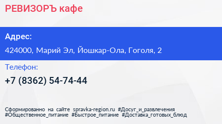 РЕВИЗОРЪ, кафе по адресу 424000, Марий Эл, Йошкар-Ола, Гоголя, 2 в дальнейшем Организация, размещена в следующих категориях: