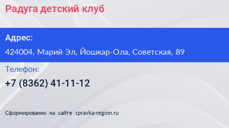 Радуга, детский клуб по адресу 424004, Марий Эл, Йошкар-Ола, Советская, 89 в дальнейшем Организация, размещена в следующих категориях: