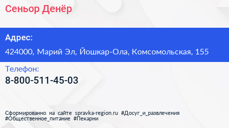 Сеньор Денёр по адресу 424000, Марий Эл, Йошкар-Ола, Комсомольская, 155 в дальнейшем Организация, размещена в следующих категориях: