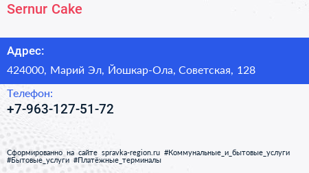 Sernur Cake по адресу 424000, Марий Эл, Йошкар-Ола, Советская, 128 в дальнейшем Организация, размещена в следующих категориях: