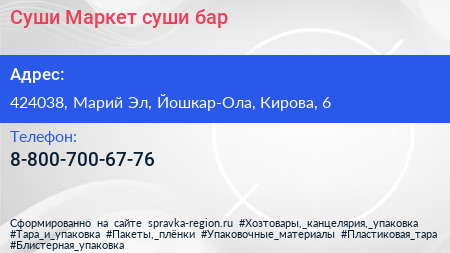 Суши-Маркет, суши-бар по адресу 424038, Марий Эл, Йошкар-Ола, Кирова, 6 в дальнейшем Организация, размещена в следующих категориях: