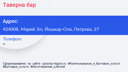 Таверна, бар по адресу 424008, Марий Эл, Йошкар-Ола, Петрова, 27 в дальнейшем Организация, размещена в следующих категориях: