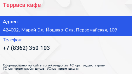 Терраса, кафе по адресу 424002, Марий Эл, Йошкар-Ола, Первомайская, 109 в дальнейшем Организация, размещена в следующих категориях: