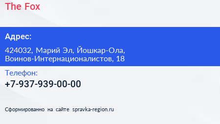 The Fox по адресу 424032, Марий Эл, Йошкар-Ола, Воинов-Интернационалистов, 18 в дальнейшем Организация, размещена в следующих категориях: