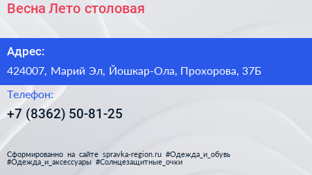 Весна-Лето, столовая по адресу 424007, Марий Эл, Йошкар-Ола, Прохорова, 37Б в дальнейшем Организация, размещена в следующих категориях: