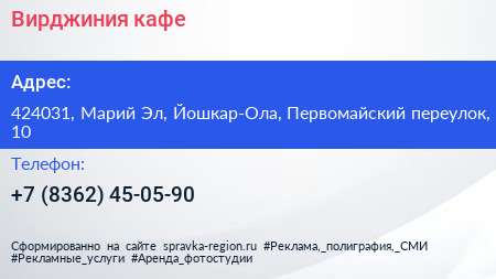 Вирджиния, кафе по адресу 424031, Марий Эл, Йошкар-Ола, Первомайский переулок, 10 в дальнейшем Организация, размещена в следующих категориях: