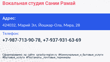Вокальная студия Сании Рамай по адресу 424032, Марий Эл, Йошкар-Ола, Мира, 28 в дальнейшем Организация, размещена в следующих категориях: