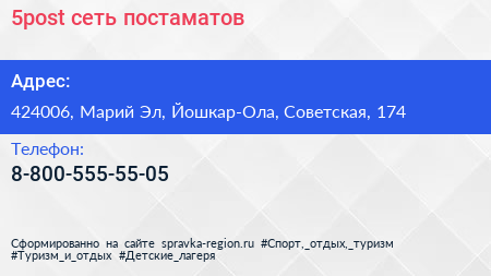 5post, сеть постаматов по адресу 424006, Марий Эл, Йошкар-Ола, Советская, 174 в дальнейшем Организация, размещена в следующих категориях: