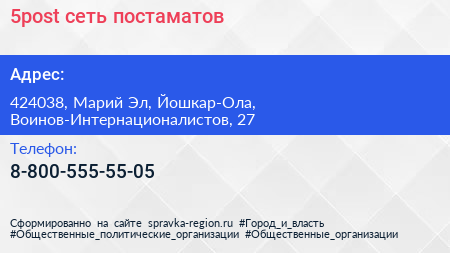 5post, сеть постаматов по адресу 424038, Марий Эл, Йошкар-Ола, Воинов-Интернационалистов, 27 в дальнейшем Организация, размещена в следующих категориях: