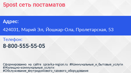 5post, сеть постаматов по адресу 424031, Марий Эл, Йошкар-Ола, Пролетарская, 53 в дальнейшем Организация, размещена в следующих категориях: