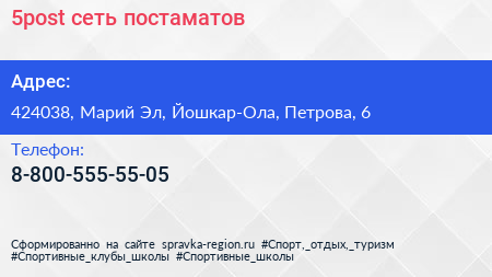 5post, сеть постаматов по адресу 424038, Марий Эл, Йошкар-Ола, Петрова, 6 в дальнейшем Организация, размещена в следующих категориях: