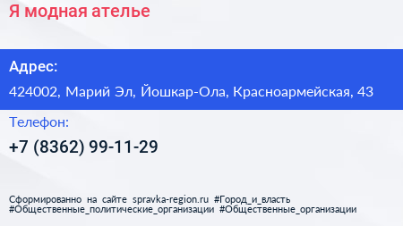 Я модная, ателье по адресу 424002, Марий Эл, Йошкар-Ола, Красноармейская, 43 в дальнейшем Организация, размещена в следующих категориях: