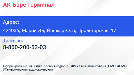 АК Барс, терминал по адресу 424036, Марий Эл, Йошкар-Ола, Пролетарская, 17 в дальнейшем Организация, размещена в следующих категориях: