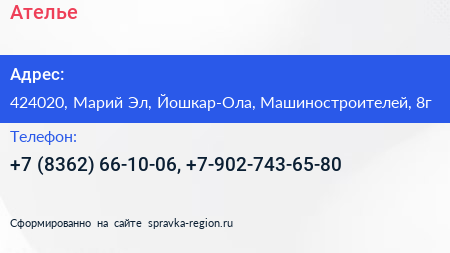 Ателье по адресу 424020, Марий Эл, Йошкар-Ола, Машиностроителей, 8г в дальнейшем Организация, размещена в следующих категориях: