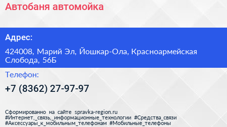 Автобаня, автомойка по адресу 424008, Марий Эл, Йошкар-Ола, Красноармейская Слобода, 56Б в дальнейшем Организация, размещена в следующих категориях: