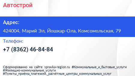 Автострой по адресу 424004, Марий Эл, Йошкар-Ола, Комсомольская, 79 в дальнейшем Организация, размещена в следующих категориях: