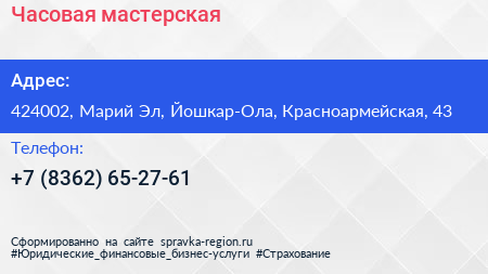Часовая мастерская по адресу 424002, Марий Эл, Йошкар-Ола, Красноармейская, 43 в дальнейшем Организация, размещена в следующих категориях: