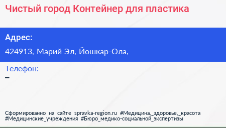 Чистый город, Контейнер для пластика по адресу 424913, Марий Эл, Йошкар-Ола, в дальнейшем Организация, размещена в следующих категориях: