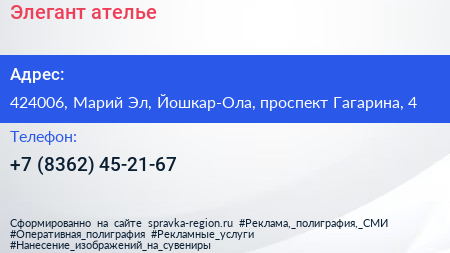 Элегант, ателье по адресу 424006, Марий Эл, Йошкар-Ола, проспект Гагарина, 4 в дальнейшем Организация, размещена в следующих категориях: