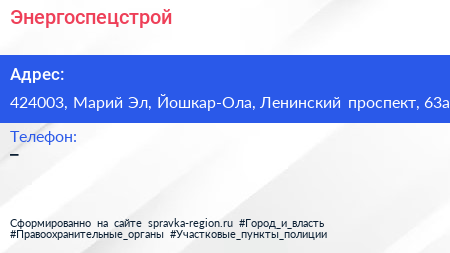 Энергоспецстрой по адресу 424003, Марий Эл, Йошкар-Ола, Ленинский проспект, 63а в дальнейшем Организация, размещена в следующих категориях:
