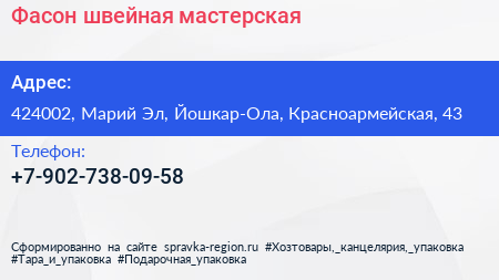 Фасон, швейная мастерская по адресу 424002, Марий Эл, Йошкар-Ола, Красноармейская, 43 в дальнейшем Организация, размещена в следующих категориях:
