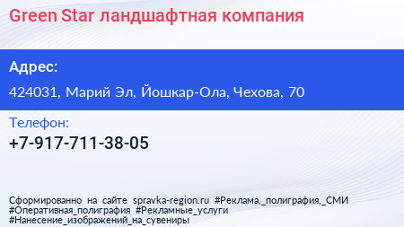 Green Star, ландшафтная компания по адресу 424031, Марий Эл, Йошкар-Ола, Чехова, 70 в дальнейшем Организация, размещена в следующих категориях: