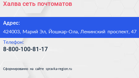 Халва, сеть почтоматов по адресу 424003, Марий Эл, Йошкар-Ола, Ленинский проспект, 47 в дальнейшем Организация, размещена в следующих категориях: