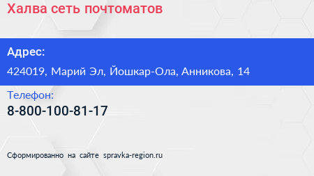 Халва, сеть почтоматов по адресу 424019, Марий Эл, Йошкар-Ола, Анникова, 14 в дальнейшем Организация, размещена в следующих категориях: