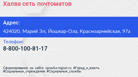 Халва, сеть почтоматов по адресу 424020, Марий Эл, Йошкар-Ола, Красноармейская, 97а в дальнейшем Организация, размещена в следующих категориях: