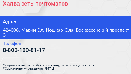 Халва, сеть почтоматов по адресу 424008, Марий Эл, Йошкар-Ола, Воскресенский проспект, 3 в дальнейшем Организация, размещена в следующих категориях: