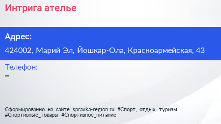 Интрига, ателье по адресу 424002, Марий Эл, Йошкар-Ола, Красноармейская, 43 в дальнейшем Организация, размещена в следующих категориях: