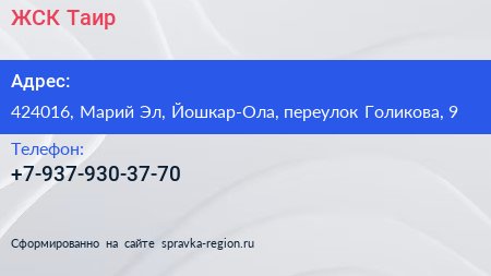 ЖСК Таир по адресу 424016, Марий Эл, Йошкар-Ола, переулок Голикова, 9 в дальнейшем Организация, размещена в следующих категориях: