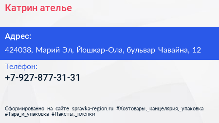 Катрин, ателье по адресу 424038, Марий Эл, Йошкар-Ола, бульвар Чавайна, 12 в дальнейшем Организация, размещена в следующих категориях: