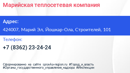 Марийская теплосетевая компания по адресу 424007, Марий Эл, Йошкар-Ола, Строителей, 101 в дальнейшем Организация, размещена в следующих категориях: