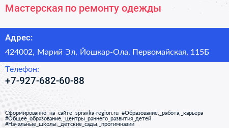 Мастерская по ремонту одежды по адресу 424002, Марий Эл, Йошкар-Ола, Первомайская, 115Б в дальнейшем Организация, размещена в следующих категориях: