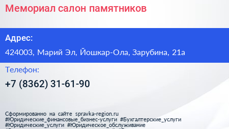 Мемориал, салон памятников по адресу 424003, Марий Эл, Йошкар-Ола, Зарубина, 21а в дальнейшем Организация, размещена в следующих категориях: