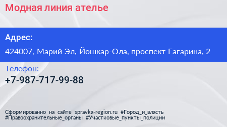 Модная линия, ателье по адресу 424007, Марий Эл, Йошкар-Ола, проспект Гагарина, 2 в дальнейшем Организация, размещена в следующих категориях: