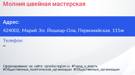 Молния, швейная мастерская по адресу 424002, Марий Эл, Йошкар-Ола, Первомайская, 115ж в дальнейшем Организация, размещена в следующих категориях: