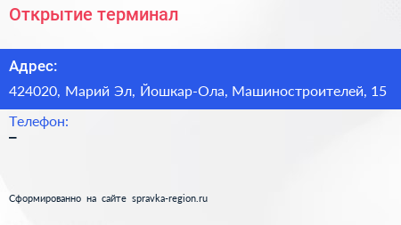 Открытие, терминал по адресу 424020, Марий Эл, Йошкар-Ола, Машиностроителей, 15 в дальнейшем Организация, размещена в следующих категориях: