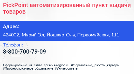 PickPoint, автоматизированный пункт выдачи товаров по адресу 424002, Марий Эл, Йошкар-Ола, Первомайская, 111 в дальнейшем Организация, размещена в следующих категориях: