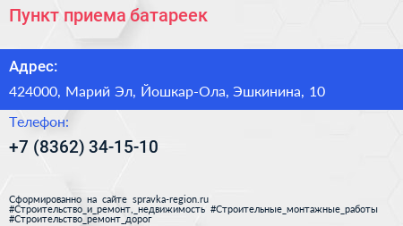 Пункт приема батареек по адресу 424000, Марий Эл, Йошкар-Ола, Эшкинина, 10 в дальнейшем Организация, размещена в следующих категориях: