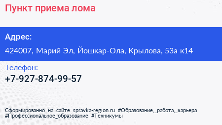 Пункт приема лома по адресу 424007, Марий Эл, Йошкар-Ола, Крылова, 53а к14 в дальнейшем Организация, размещена в следующих категориях: