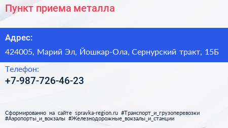 Пункт приема металла по адресу 424005, Марий Эл, Йошкар-Ола, Сернурский тракт, 15Б в дальнейшем Организация, размещена в следующих категориях: