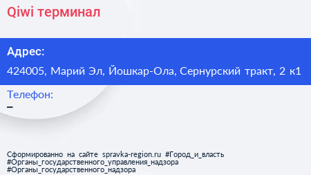 Qiwi, терминал по адресу 424005, Марий Эл, Йошкар-Ола, Сернурский тракт, 2 к1 в дальнейшем Организация, размещена в следующих категориях: