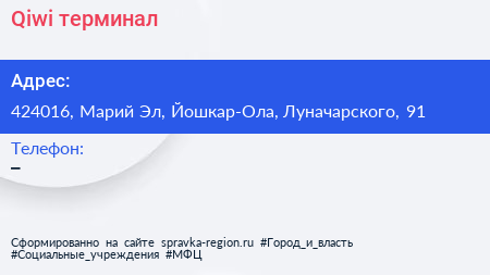 Qiwi, терминал по адресу 424016, Марий Эл, Йошкар-Ола, Луначарского, 91 в дальнейшем Организация, размещена в следующих категориях: