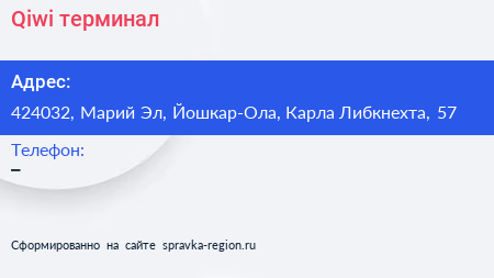 Qiwi, терминал по адресу 424032, Марий Эл, Йошкар-Ола, Карла Либкнехта, 57 в дальнейшем Организация, размещена в следующих категориях: