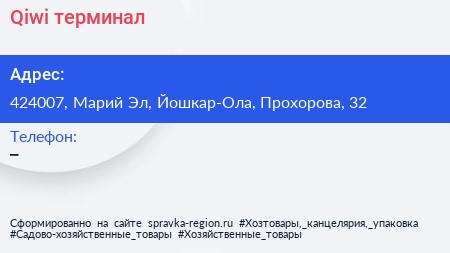 Qiwi, терминал по адресу 424007, Марий Эл, Йошкар-Ола, Прохорова, 32 в дальнейшем Организация, размещена в следующих категориях: