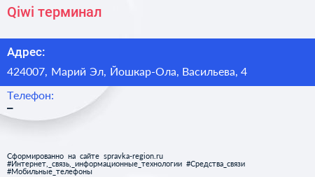 Qiwi, терминал по адресу 424007, Марий Эл, Йошкар-Ола, Васильева, 4 в дальнейшем Организация, размещена в следующих категориях: